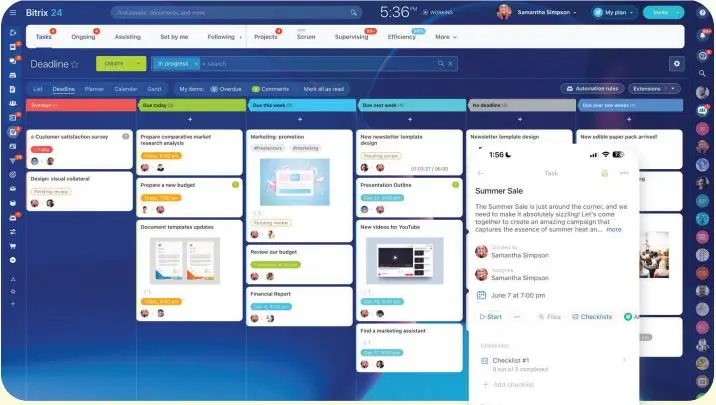 Además, Bitrix24 permite a las empresas gestionar múltiples proyectos simultáneamente, lo que facilita la organización y el seguimiento de distintas iniciativas. Esto es especialmente beneficioso para empresas que manejan varios clientes o proyectos a la vez, permitiendo una mejor distribución de recursos y tiempos.